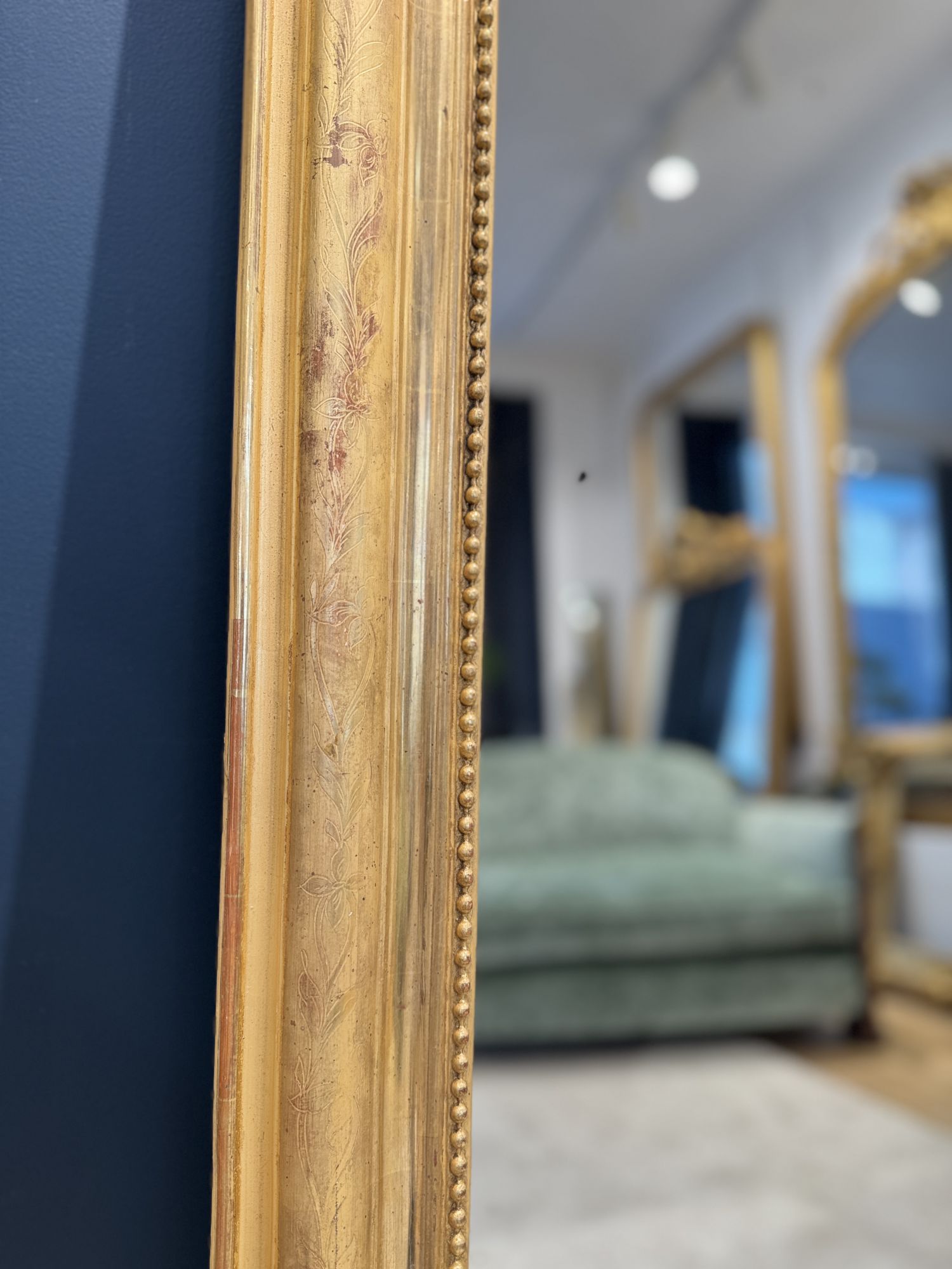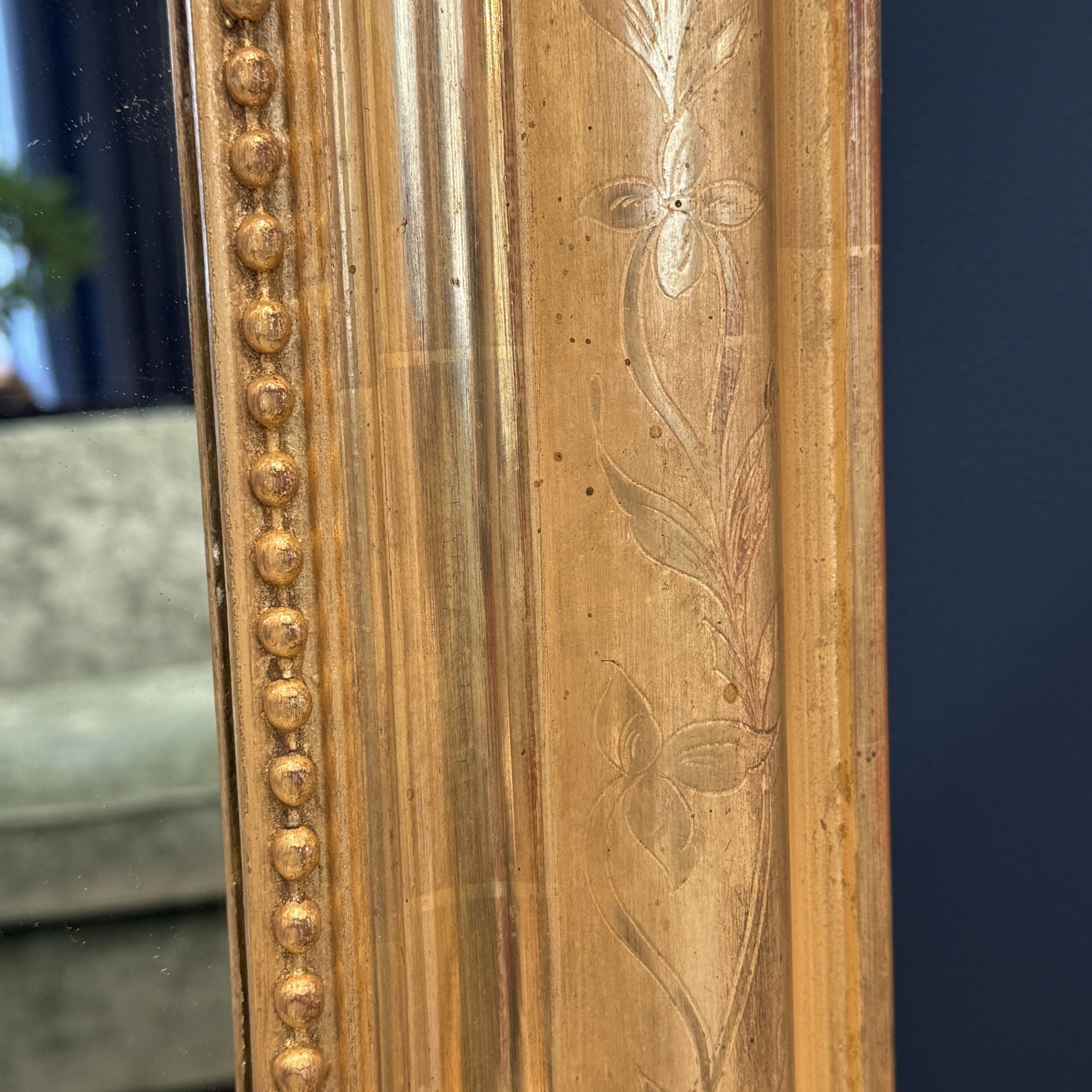 Belle moulure Louis Philippe perlée rehaussée d'un décor gravé de motifs floraux et feuillagés dans un contraste d'or mat et or brillant .