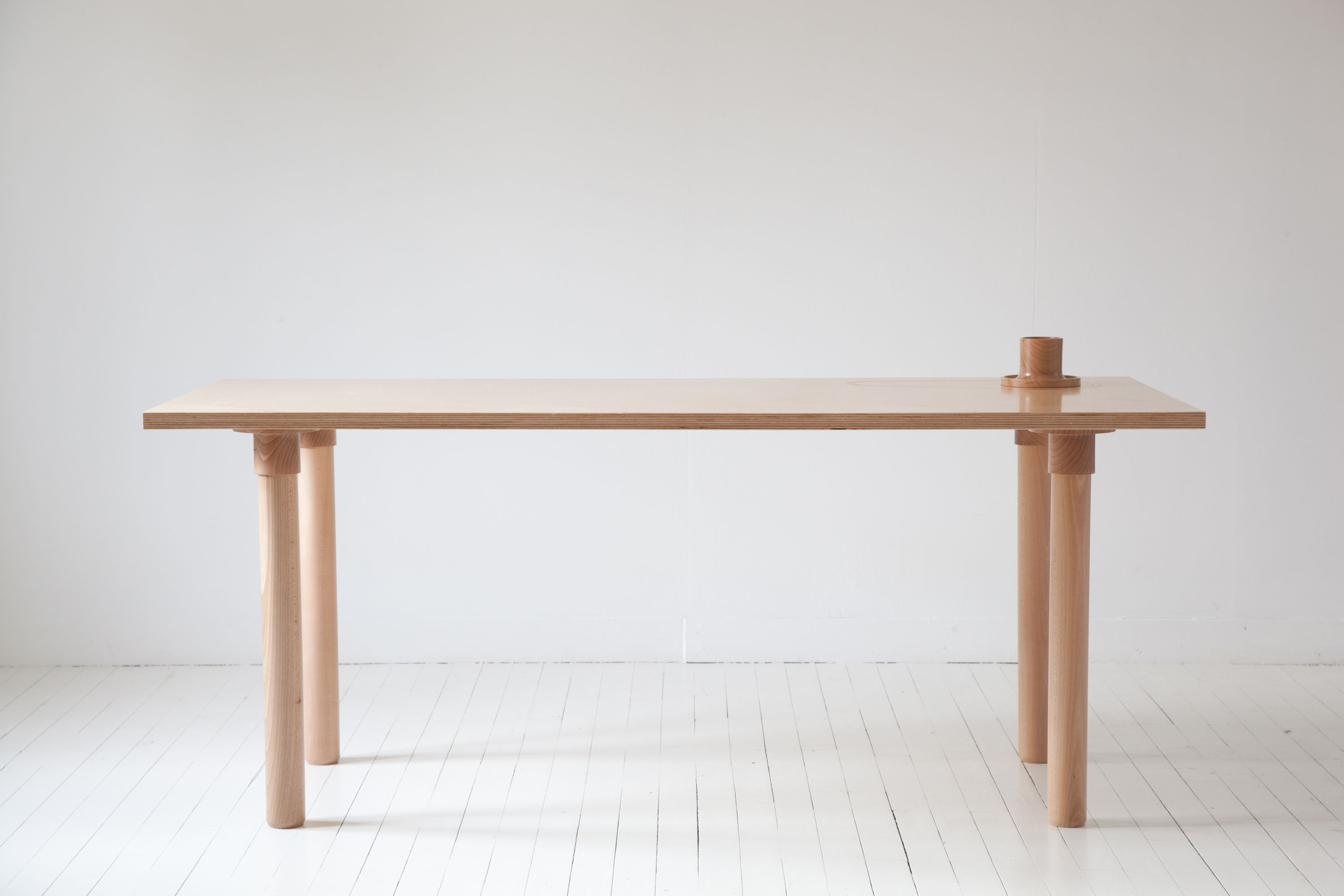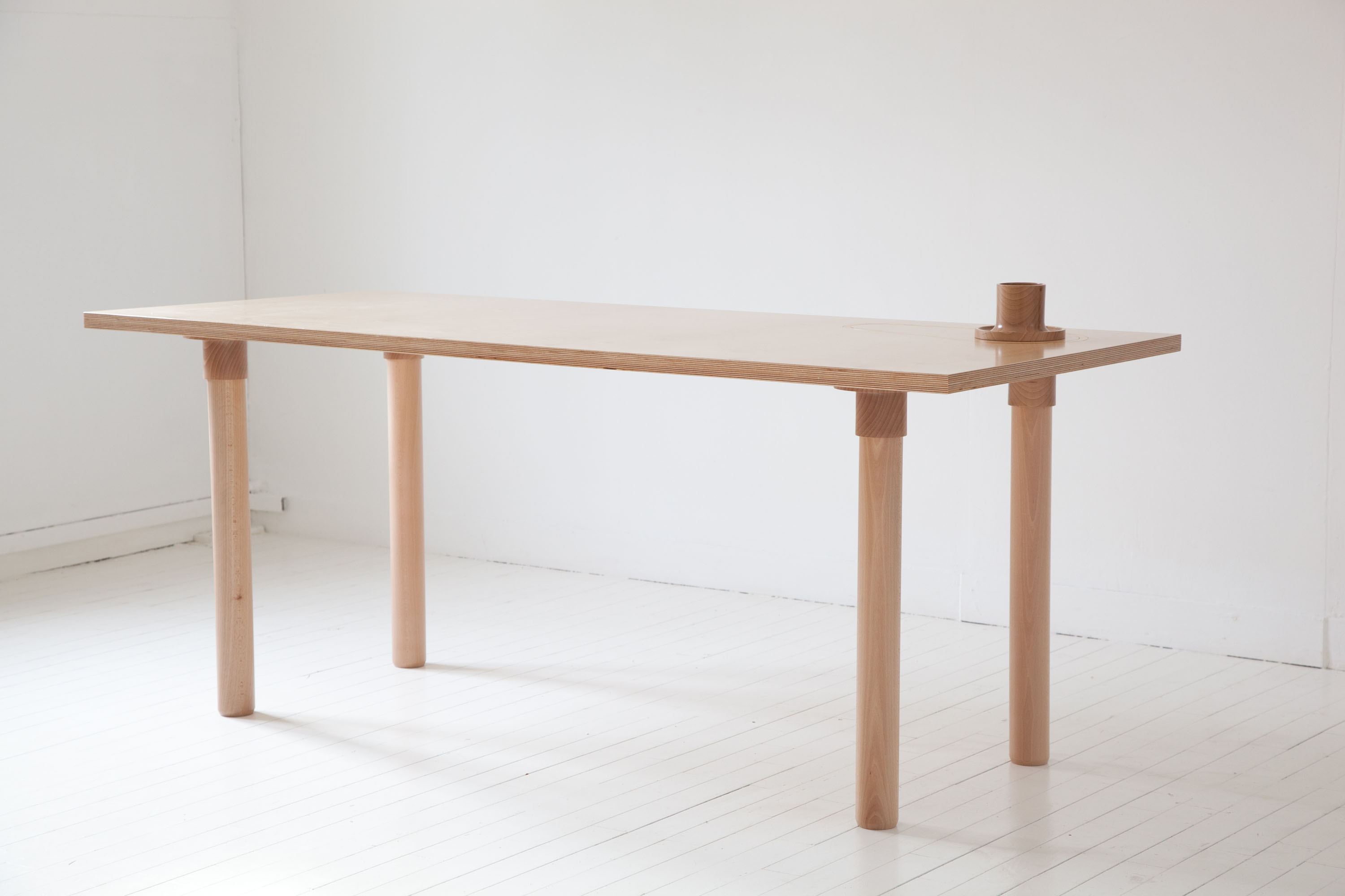 Le défi du bureau Îlot réside dans ses pièces d’assemblage, tournées manuellement. Elles permettent d’emboiter simplement les différents éléments du bureau, de les connecter. Elles s’inspirent formellement des objets réalisés par les tourneurs et leurs machines.