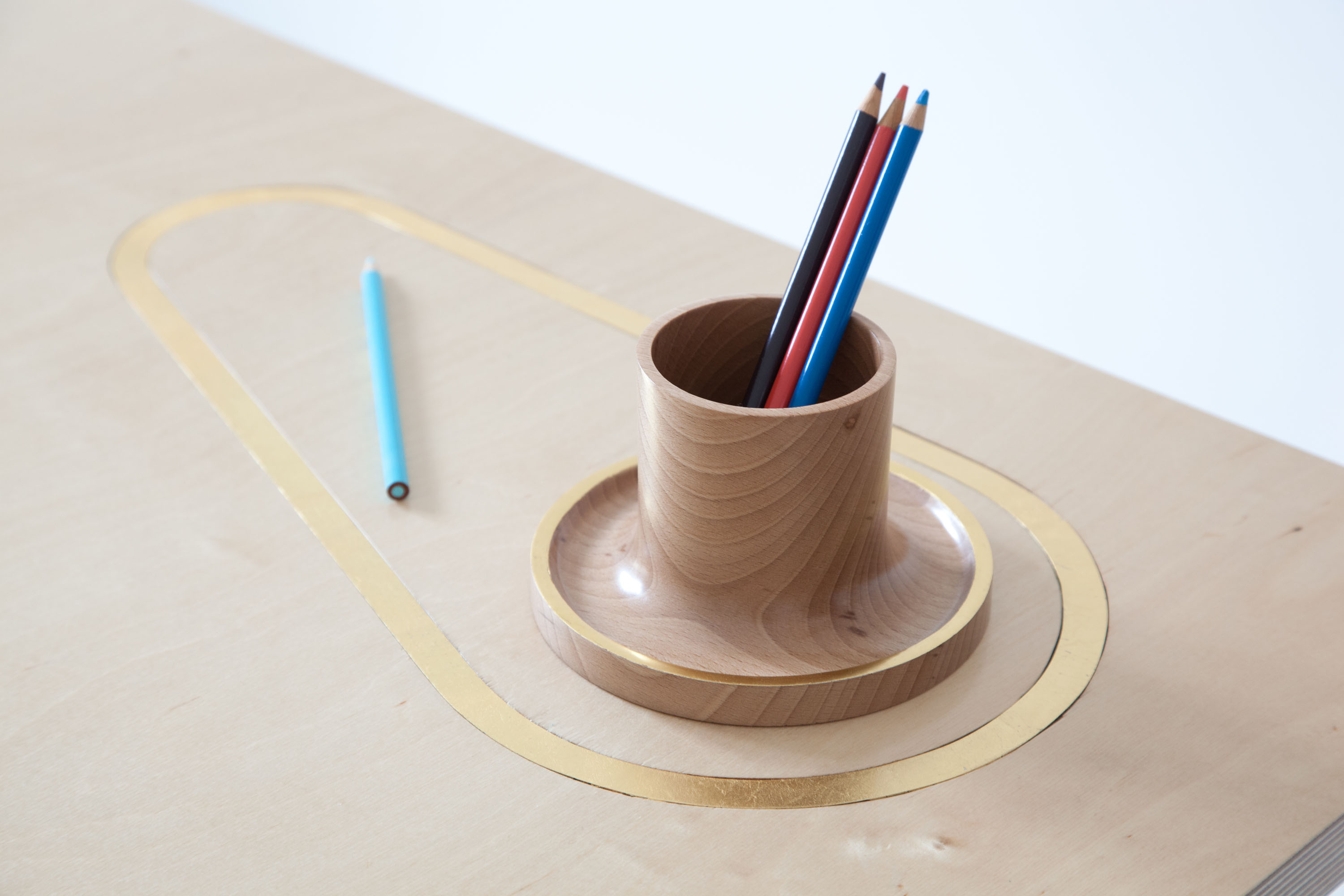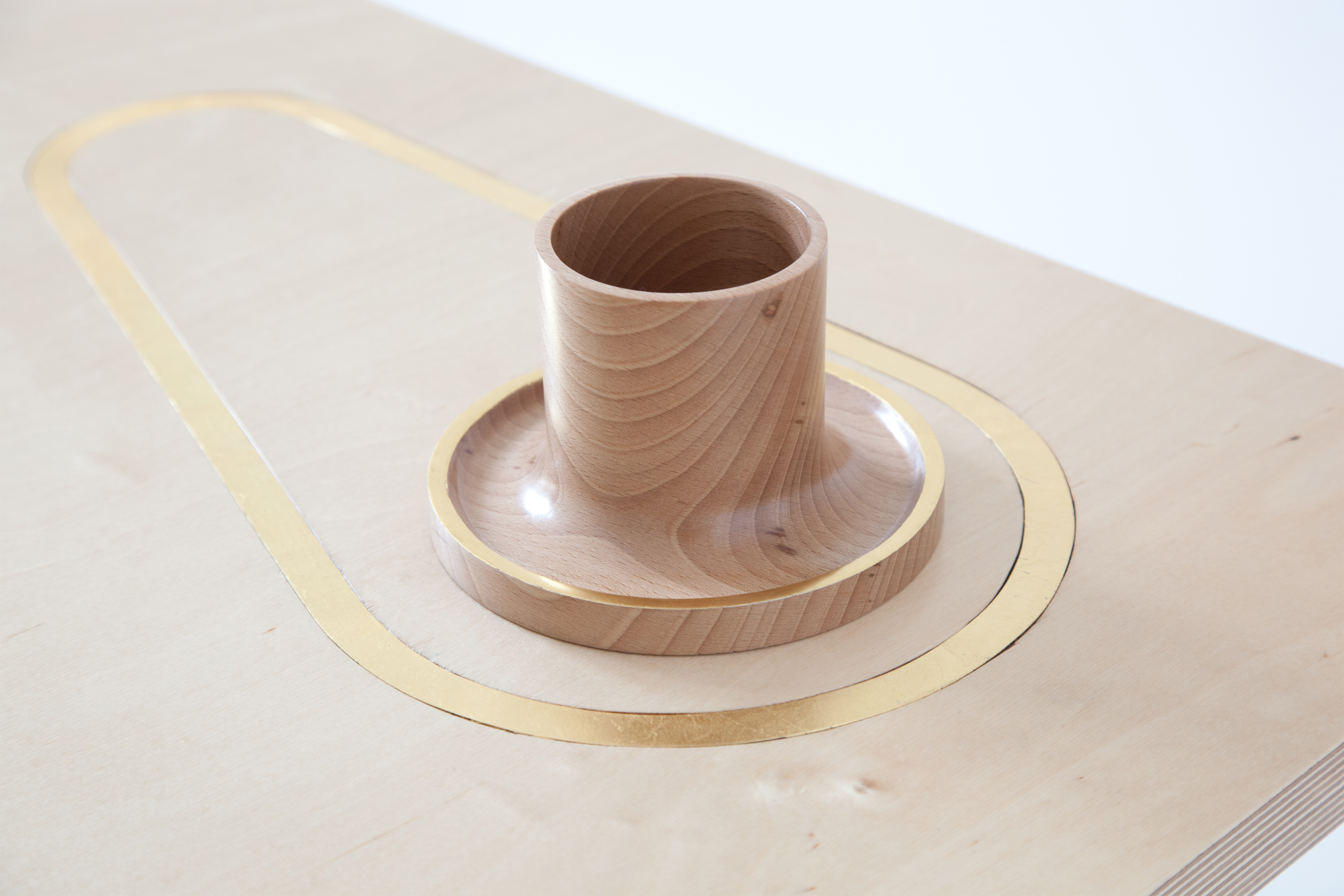 Une cinquième pièce d’assemblage est disposée sur le plan de travail, tel un îlot isolé. Elle sollicite notre imagination, nous interroge. Mise en valeur par la dorure, elle devient un objet à part entière et précieux qui offre de nouveaux usages. Elle valorise ainsi le travail des artisans, leur savoir-faire, et met en lumière ces systèmes d’assemblage que l’on tend à dissimuler.